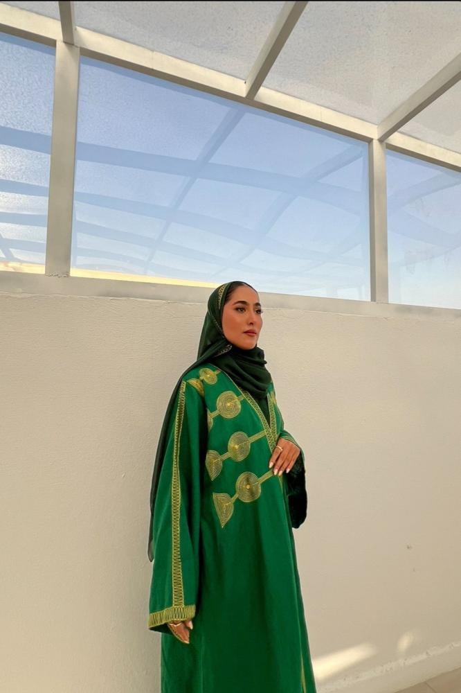 تصميم عباية اليوم الوطني مستلهمه من عباءة الدفة التي ارتدتها العروس قديمه ليلة زفافها